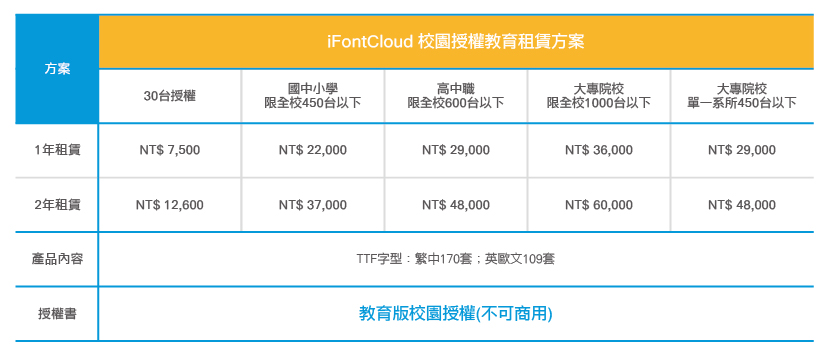 因應雲端科技的發展,針對學校銷售的盒裝字型(package)產品,將運行至2018年3月31日止,於4月1日起,全面改由文鼎雲字庫iFontCloud租賃字型方式。