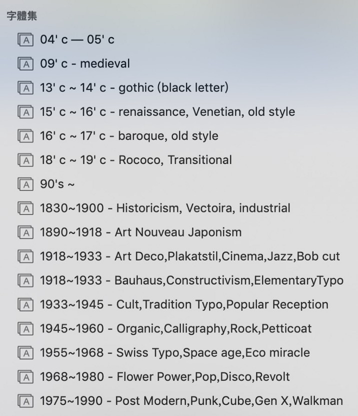 推廣字型的心願逐漸落實了,但葉忠宜並未忘記除了推廣以外,自己身為設計師該做的功課。翻開電腦裡的字體簿,裡頭有學生時期一直到現在,花費重金「收藏」的各種字體,還依照年代、大師、國家等不同項目進行分類。最近則是愛上蒐集2015年以後,國外冷門小型公司出的字體,「因為他們可以很外放,做出大家少見大膽且破格,但又好用的作品。」