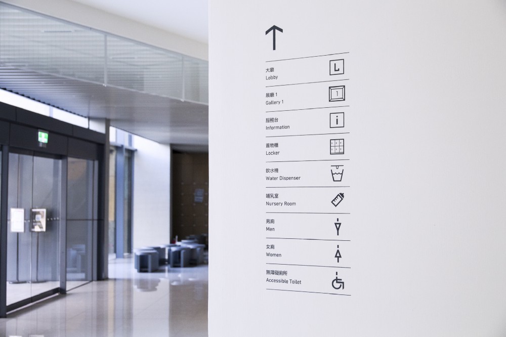 指標從平面躍升成為導視系統,Roger 大多採用質地佳的「絹印灰漆」印在牆上,讓指標彷彿成為建築不可分割的部分,也降低觀眾的視覺負擔。