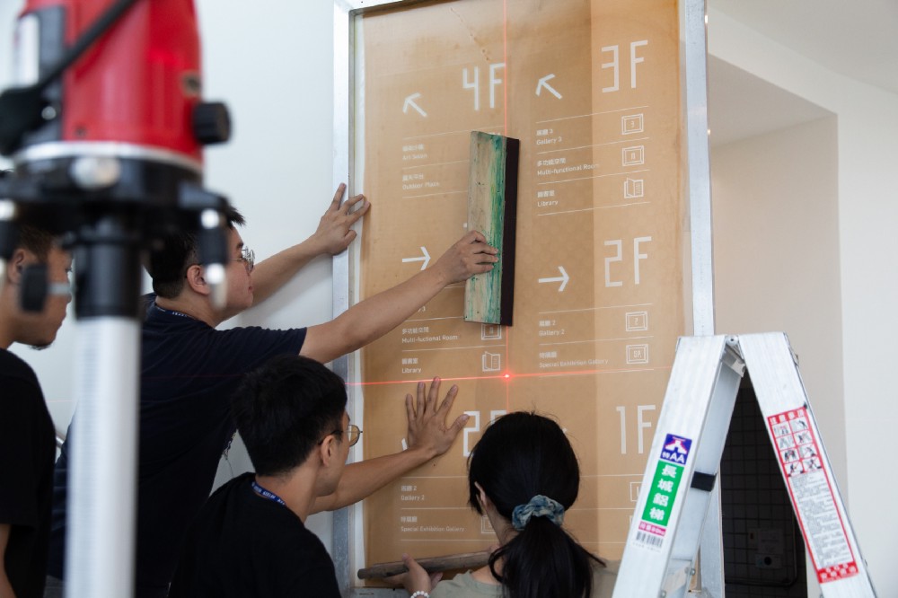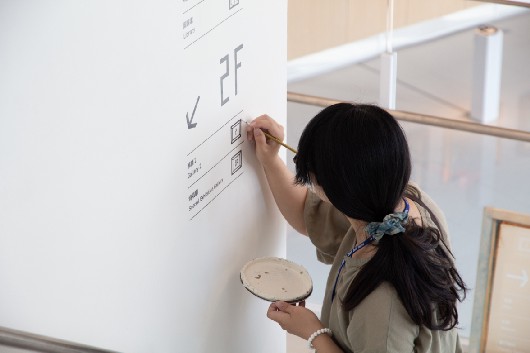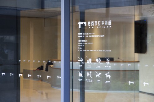 考量嘉美館腹地不大、空間單純,指標應降低觀眾視覺負擔、聚焦在展覽和作品本身。因此,工法上除了少數玻璃面材使用卡典西德割字,其他位置都採用質地更佳的「絹印灰漆」印在牆上,讓指標彷彿成為建築不可分割的部分。指標的重點除了美觀外,更要符合通用設計的原則,因此在挑選字體上,Roger 選用「文鼎UD晶熙黑體」,因為該字體設計有大字面、大字腔的特性,讓筆畫多的字即使遠距閱讀也不會沾黏而難以辨別。再來,它對設計師十分友善,因為這套字型整合中文歐文,大幅減少中英混排的困難。然而 Roger 點出指標選用字體仍要因地制宜,而非陷入獨厚無襯線黑體的迷思中。他說,其實只要光線足夠、觀看距離夠近,有襯線字也能清楚辨識,以日本設計師色部義昭設計的展覽指標為例,活用明體、圓體反而更具特色。