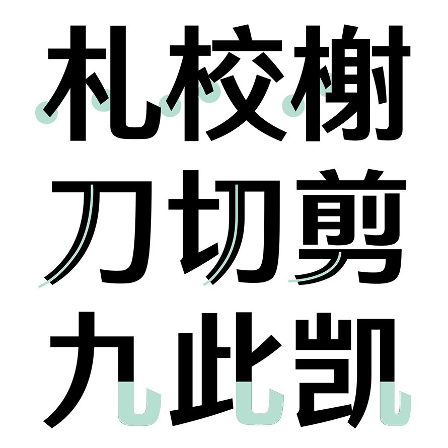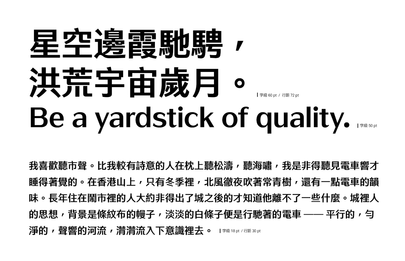 筆畫直粗橫細,比例考量標題文字重視力度、內文強調清晰均勻,漢字以較舒適的70%起始;英歐文則以視覺校正調整至56%。切角現代簡練,減少過多裝飾,提高字體識別性。