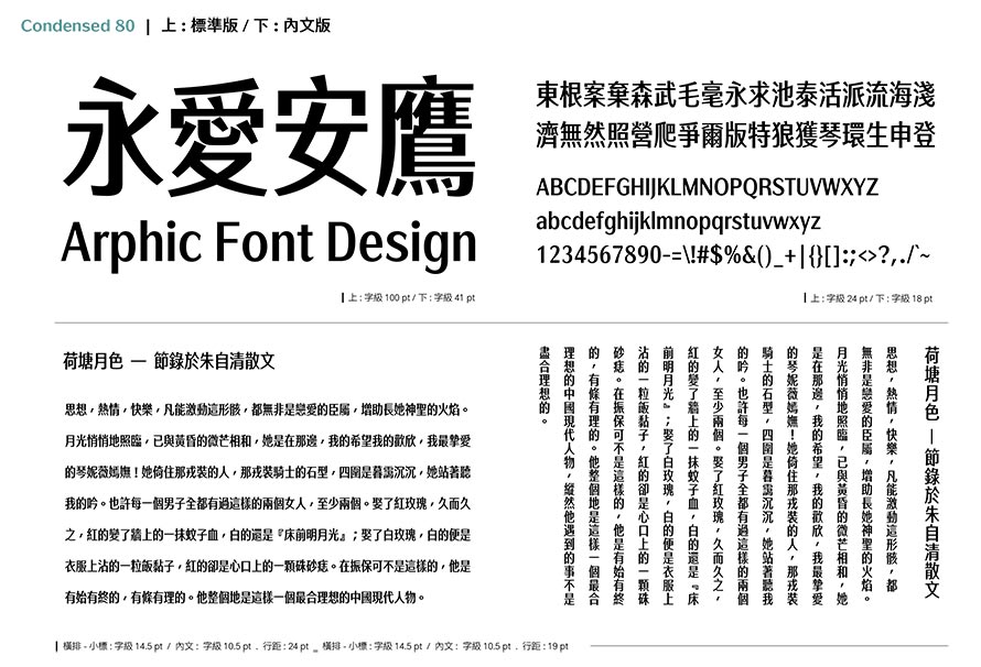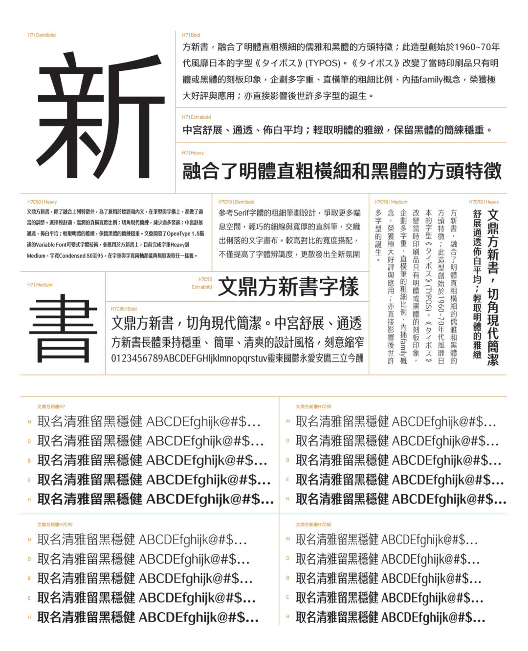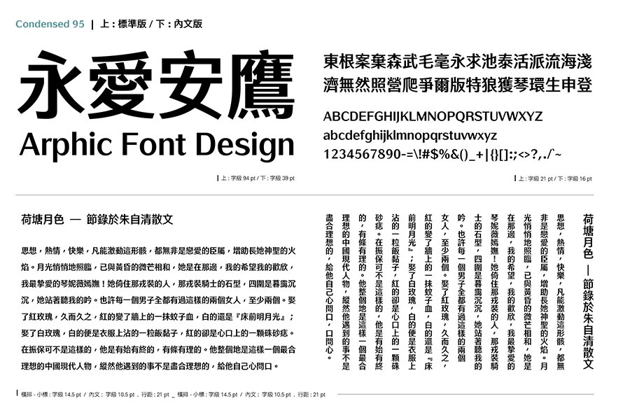 文鼎方新書融合黑體和明體的優點,加上反覆雕琢視覺濃淡,所以排版視覺清晰不突兀。拓展Condensed系列後,使方新書在排版方面的表現更為出色,提供給使用者多元選擇。