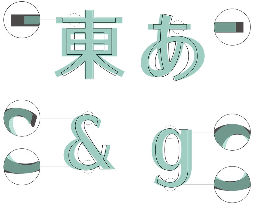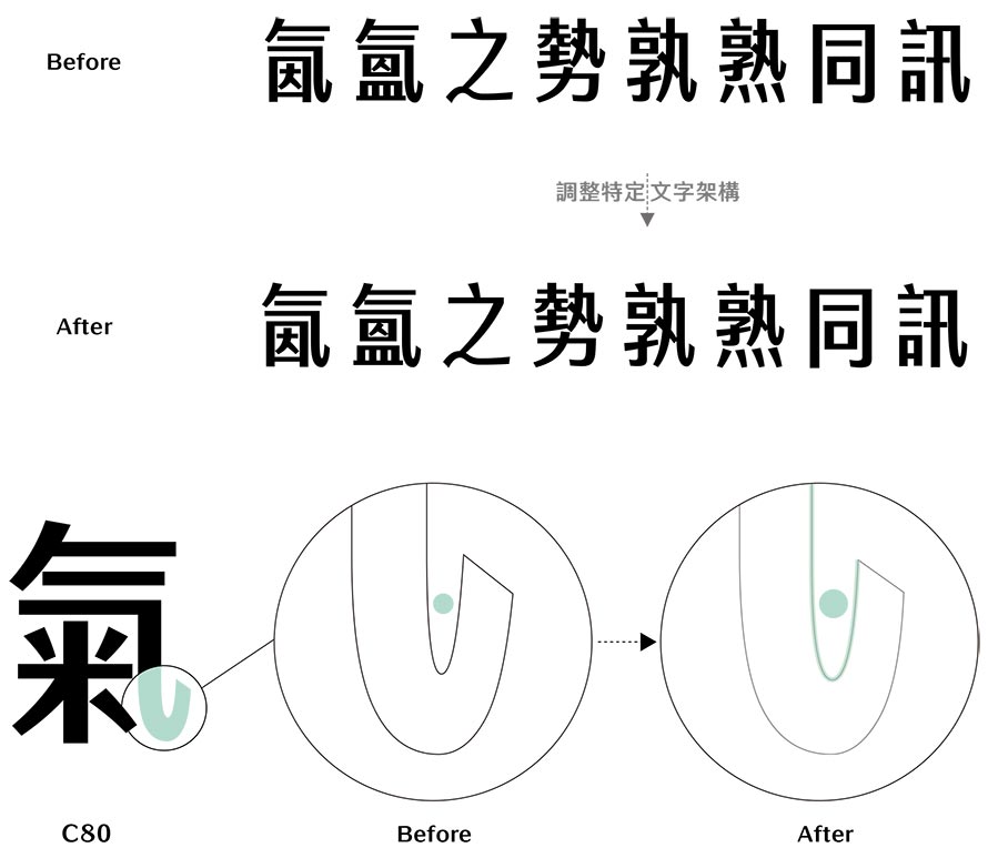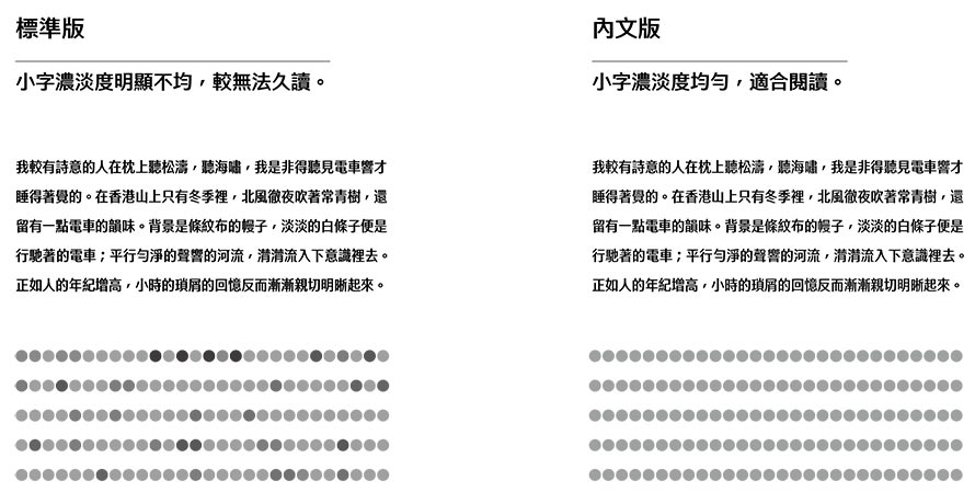 經過反覆檢測及嘗試,針對濃淡度較高的字進行漸進調整,濃淡度較低的字則維持原設計,以維持整體字重並兼顧小字閱讀的舒適。