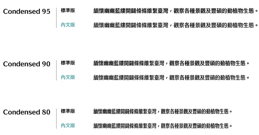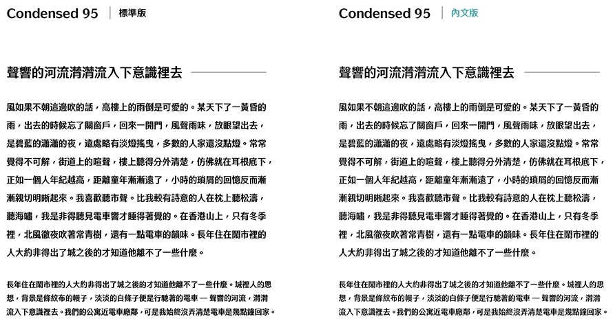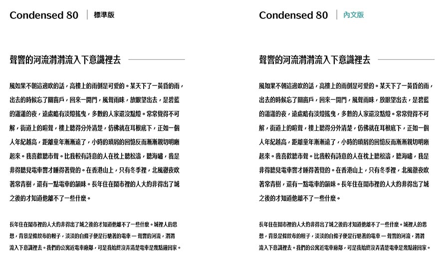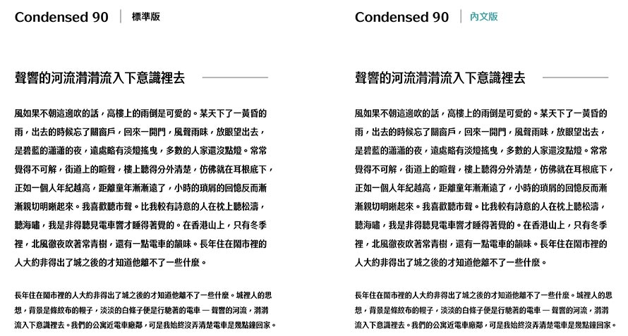 設計Condensed 版本時,因空間縮窄,用於小字、內文排版時難免出現版面視覺粗、糊、濃淡不均的狀況;為了改善此問題,測試Condensed 字元灰度後,特別製作了濃淡度調整- 內文版,讓Condensed 版本在小size 閱讀上更加舒適、清晰。