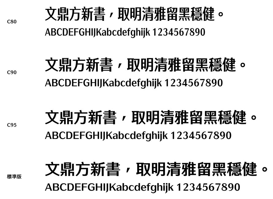 維持Heavy 字重的份量及易讀性,文鼎設計團隊選擇壓縮標準版字型的 95%(C95)、90%(C90)、80%(C80) 三個版本。方新書 Condensed 秉持穩重、 簡單、清爽的設計風格,刻意縮窄字身讓方新書再多幾分詩意。
