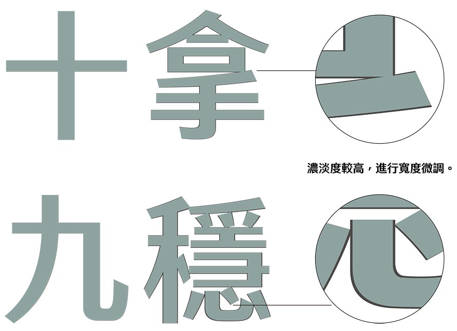部分特定架構,也因為縮窄後易有糊點,所以刻意減低筆畫濃度,平衡灰度。