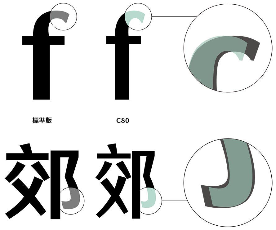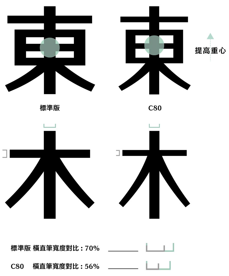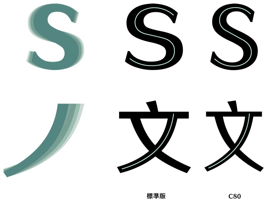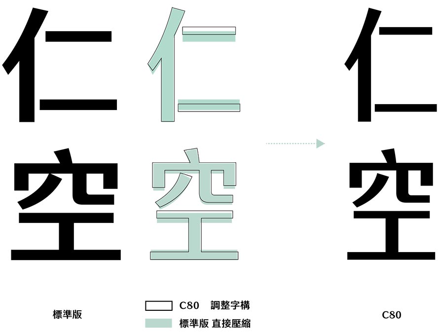 方新書Condensed 之筆型因應橫向空間縮減做了微調: 空間釋放時,撇捺弧度變大,舒展氣勢,而 C80 空間較擠,則將弧度稍稍修緩。