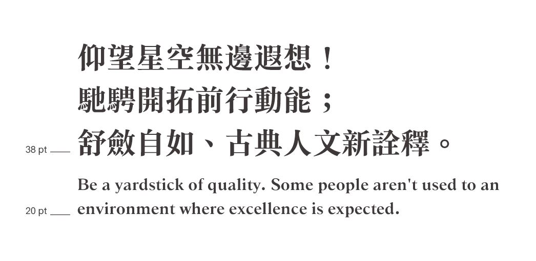 標題應用(Display) 提供四種不同氛圍設計,橫筆粗度16 到62(EM Square=1000 ) 的響應式設計,使用者可依據使用情境,選取適當字型使用。