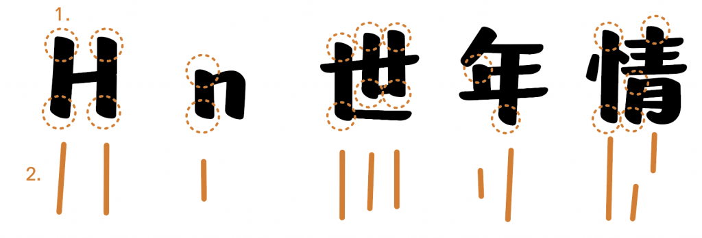 1. Starting strokes share the same right-down angle as vertical strokes