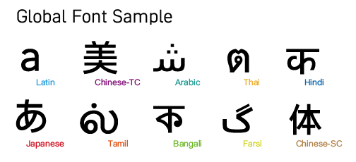 繁体字、簡体字、日本語、韓国語、英語、ベトナム語、キリル文字、ギリシャ語、トルコ語、ヘブライ語、タイ語、ヒンディー語、ベンガル語、タミル語、アラビア語、ペルシャ語など、800種類以上の多言語のビットマップフォントを保有しております。