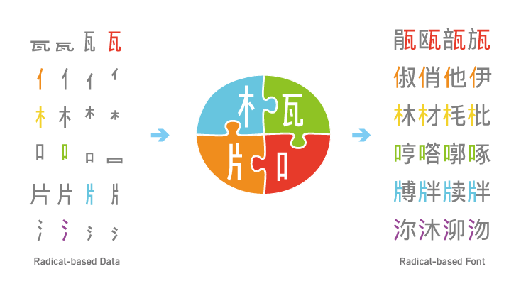 文鼎RTTフォントは「部首ベース(Radical-base)技術」を採用しており、漢字特有のパーツを共有できる点を活かし、フォントデータ容量を大幅に削減したRTTフォントを開発しました。